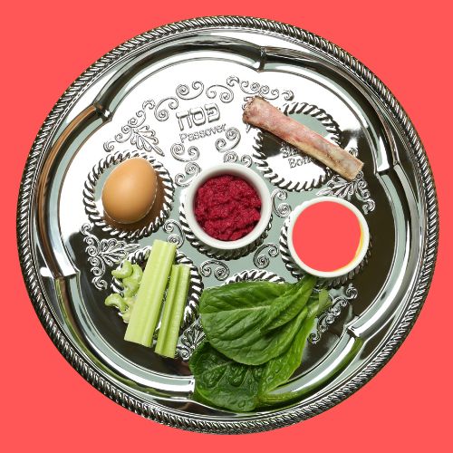 Secondo il rito stabilito, tre matzot (pane azzimo) una sopra l’altra, coperte ciascuna separatamente, sono disposte su un vassoio che comprende una serie di cibi simbolici: il Karpass, o erbe verdi (sedano, prezzemolo); l’acqua salata per ricordare il sapore delle lacrime dei figli d’Israele durante la loro schiavitù; il Maror, erbe amare, per ricordare l’amarezza della vita in Egitto (lattuga, indivia, rafano, ecc.); il Harosset, impasto a base di datteri, noci, mele, mandorle, cannella con del vino, simbolo della malta usata dagli schiavi ebrei per fabbricare i mattoni; lo Zerowaʿ: un osso per ricordare il sacrificio dell’agnello pasquale all’epoca del Tempio di Gerusalemme; il Bēṣa: un uovo sodo, in ricordo della distruzione del Tempio di Gerusalemme.