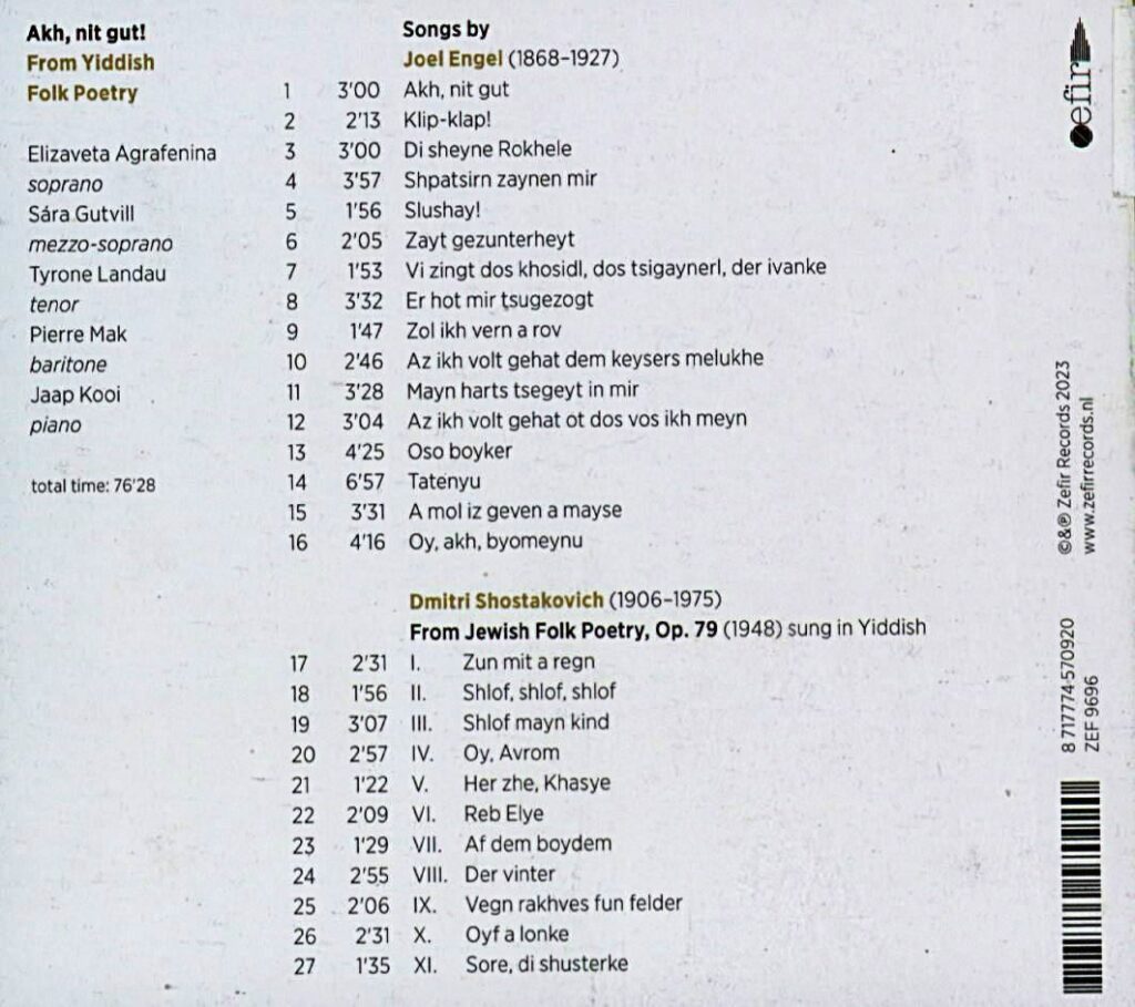 Ce CD publié en 2023 est le fruit d’un travail intense mené par plusieurs artistes, et en particulier la mezzo-soprano hollandaise Sára GutviII qui rêvait depuis longtemps d’interpréter en yiddish le cycle de chants De la poésie populaire juive (op. 79) de Dimitri Chostakovitch (1906-1975), écrit originellement en russe.