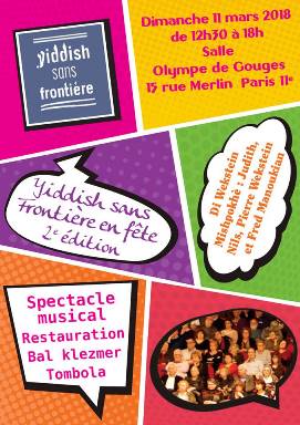 « Yiddish sans Frontière » est la réunion d’associations ashkénazes et sépharades œuvrant pour la mémoire, l’Histoire, la rayonnement, la diffusion et la pérennité des cultures juives. « Yiddish sans Frontière » organise un brunch festif et musical pour soutenir le développement de ses activités. Spectacle musical, restauration, bal klezmer et tombola…
