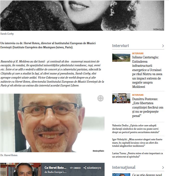 Interview, en roumain, de Hervé Roten par Victor Eskenasy, sur Sarah Gorby et l’Institut Européen des Musiques Juives. Consulter l’interview sur le site de Radio Europa Liberà Moldova Télécharger l’Interview, …