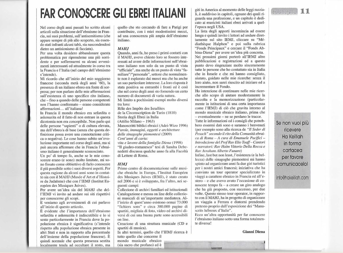 Article (en italien) de Gianni DIENA, relatant sa collaboration avec l’IEMJ, pour faire connaître les Juifs italiens en France