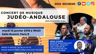 La promotion du patrimoine musical judéo-andalous est une des grandes traditions de l’ECUJE. Avec ce concert qui se déroulera à la Salle Rossini à Paris, c’est un programme inédit qui vous est proposé avec la vedette Meni Cohen, entouré des deux jeunes chanteurs qui montent, Moshé Barchechat et Raphaël Skoury.
