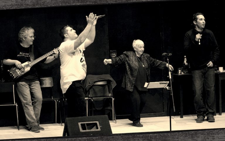 Esther Bejarano, est née en Allemagne, en décembre 1924, dans une famille de musiciens. Son père hazzan, ne tarde pas à l’envoyer faire ses gammes. Le piano, c’est la base ! La musique la sauvera. Elle ne le saura qu’en 1943, lorsque déportée à Auschwitz après deux ans passés au camp de travail à Rietz-Neuendorf, et des journées entières à transporter des pierres, elle est admise dans l’orchestre de jeunes filles où elle joue de l’accordéon. « Le piano du pauvre », elle le découvre et l’apprivoise intuitivement, sans jamais l’avoir appris parce qu’elle sait le langage des notes ! Fin 1943, Esther est transférée à Ravensbrück. C’est lors de l’effroyable Marche de la Mort, en 1945 qu’elle parvient à s’échapper. Elle a 21 ans. A côté de son engagement politique et du rôle de témoin, la musique reste pour elle le vecteur le plus direct pour communiquer, pour lutter contre l’oubli des crimes nazis. Ainsi, depuis 2009, avec son fils Joram, elle s’est jointe aux rappeurs Kultu Yurtseven et Rosario Penino, issus de l’immigration italo-turque et leur groupe Microphone Mafia. Polyphonie de langue, en yiddish, grec, turc, français, allemand, hébreu, le groupe interprète notamment de chants de résistance juive, des chants du ghetto, des chansons de Brecht, anti-militaristes, anti-fasciste et pacifiques. Esther chante. Esther rappe. Esther a 93 ans et la vie devant elle.