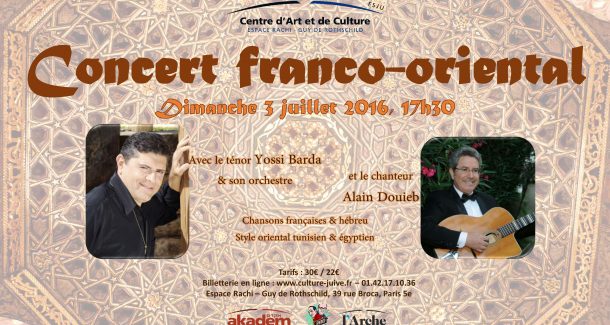 Alain Douieb, interprète auteur et compositeur, fera la première partie de ce concert prestigieux, le Centre d’Art et de Culture a déjà eu le plaisir de le programmer il y a deux ans. Il est surtout connu pour ses reprises endiablées du répertoire d’Enrico Macias. Il fera voyager son public dans l’ambiance, la nostalgie et la gaieté. Son répertoire est aussi composé de chansons françaises, israéliennes et orientales.