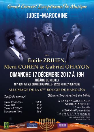 Emile Zrihen, Meni Cohen, Gabriel Ohayon et leurs musiciens sont réunis pour un formidable concert de musique judéo-marocaine avec allumage de la sixième bougie de Hanouka.