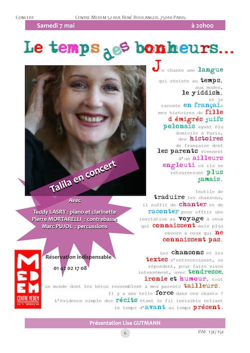 Dans ce spectacle, sur les compositions et arrangements de Teddy Lasry, Talila chante en anglais, français et yiddish.