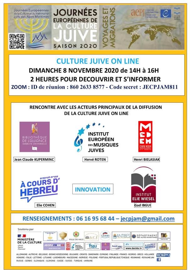 Les Journées Européennes de la Culture et du Patrimoine juifs des Alpes Maritimes vous invitent à une conférence ZOOM pour découvrir et s’informer sur les acteurs de la culture juive et leurs représentants, parmi lesquels l’Institut Européen des Musiques Juives, la Bibliothèque de l’Alliance, l’Institut Elie Wiesel et le Medem…