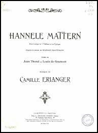 1913 hatte Erlanger Hannele Mattern fertiggestellt, das im darauffolgenden Jahr an der Opéra-Comique aufgeführt werden sollte. Das Libretto basierte jedoch auf dem gleichnamigen Theaterstück von Gerhard Hauptmann, und während des gesamten Krieges war es undenkbar, in Paris ein Werk aus der Feder eines deutschen Autors aufzuführen. Nach dem Tod von Camille Erlanger am 24. April 1919 geriet seine Musik, die nicht in die ästhetische Strömung der Années folles passte, allmählich in Vergessenheit, was die Chancen von Hannele Mattern, aufgeführt zu werden, erheblich verringerte. Dennoch wurde das Werk 1950 in Straßburg uraufgeführt, ohne viel mehr als höfliche Gleichgültigkeit hervorzurufen. Und dies ist sicherlich das letzte Mal, dass ein Werk von Erlanger auf der Bühne aufgeführt wird.