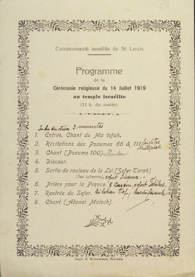 Zu den bemerkenswerten Dokumenten gehören eine Partitur der Marseillaise (französische Nationalhymne), die 1918 in Elsass-Lothringen veröffentlicht wurde, und das Programm einer Synagogenfeier, mit der die Rückkehr des Elsass zu Frankreich gefeiert wurde. Der Bestand enthält auch eine seltene Fotografie des Rabbiners Isaïe Schwartz, Oberrabbiner von Frankreich, die 1942 aufgenommen wurde.