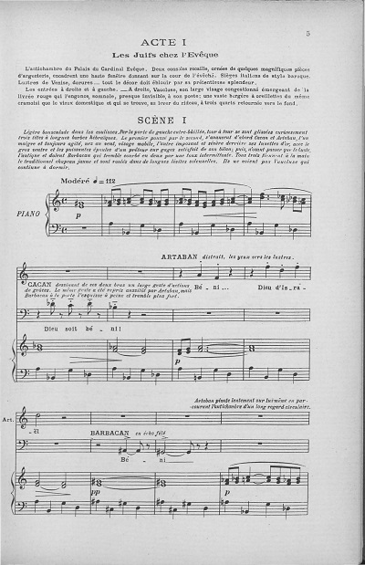 […] Der erste Akt formt einen Prolog, in welchem drei alte Juden des Ghettos von Carpentras zu sehen sind: Artaban, ein Finanzier, Babacan, der Synagogenwärter und Cacan, ein Theaterliebhaber, kommen als Delegation zum städtischen Kardinalbischof, um ihn um Erlaubnis zu bitten, das Drama Esther am nächsten Tag aufführen zu dürfen. Im Vorzimmer des Bischofpalastes werden sie von Vaucluse, dem bischöflichen Kammerdiener, zunächst eher schlecht empfangen. Vaucluse hatte immer schon eine ungewöhnliche Marotte: nämlich die, die Juden des Comtat Venaissin, durch von ihm selbst in seiner Freizeit komponierten Weihnachtsliedern, zu bekehren; […] Da er (der Kardinalbischof) erst kürzlich aus Rom gekommen war, ist er ziemlich überrascht, Juden eines solch eigenartigen Typus in Carpentras vorzufinden; […] Doch nachdem sie gegangen sind, verspricht er sich insgeheim von der Darbietung von der Königin Esther, um es noch besser als Vaucluse zu machen, den Versuch einer Massenbekehrung aller Juden der Stadt zu wagen.“ Armand Lunel