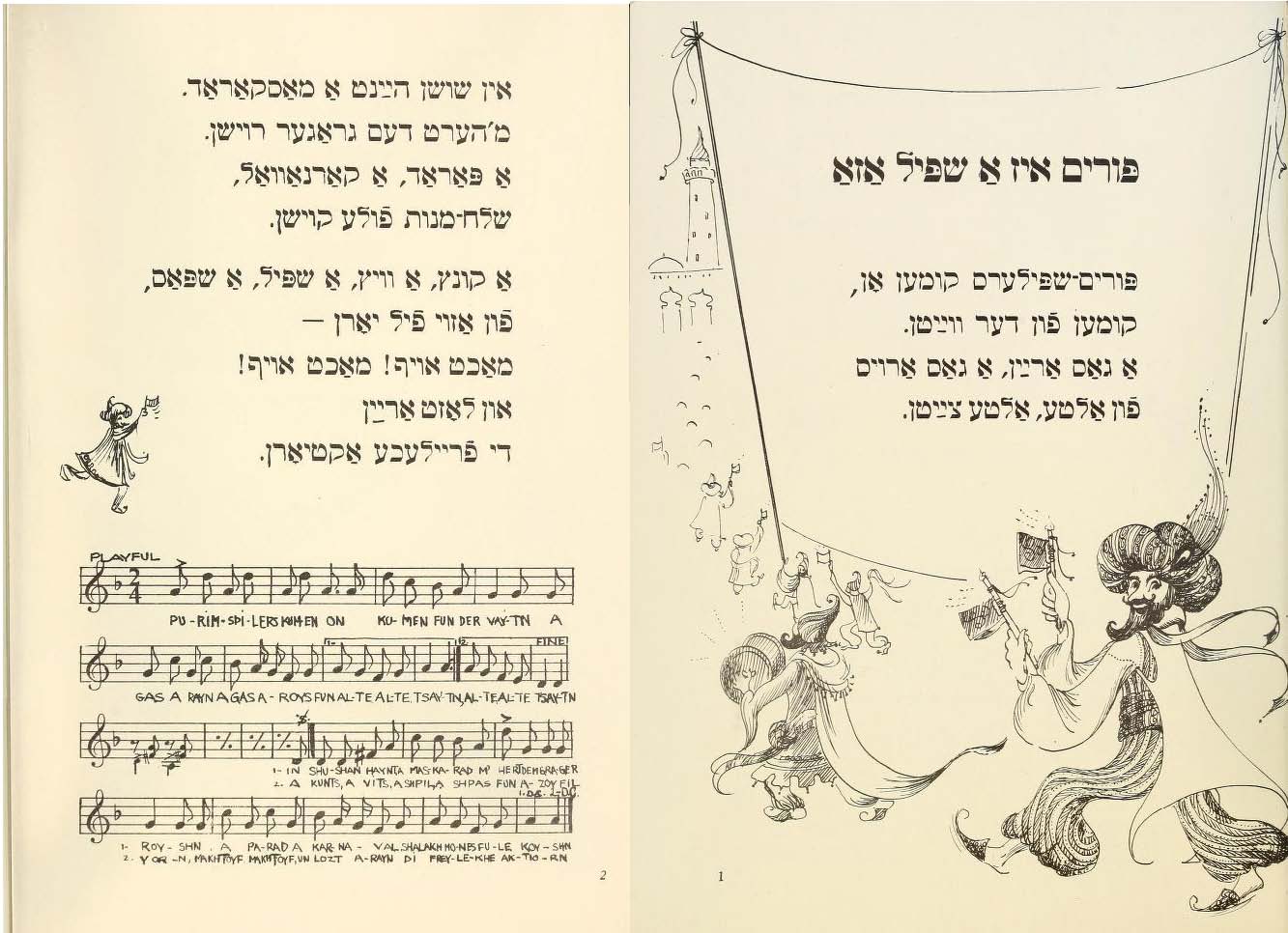 Purim ist so ein Spiel ist ein musikalisches Gedicht, verfasst auf Jiddisch, geschrieben von Mirl Hofman (der das Pseudonym Gabriel Tolies verwendete), welches 1968 in New York veröffentlicht wurde und dessen Musik von Malke Gotlib (der Schwester von Chane Mlotek, einer bekannten Komponistin jiddischer Lieder) komponiert wurde. Diese Geschichte für Kinder wurde in einer einfachen Sprache verfasst, um so den Sinn des Gedichts für eben diese leichter verständlich zu machen. Als beispielsweise Haman sieht, dass Mordechai zu einem häufigen Gast im Palast des Königs wird, warnt dieser den König schnell, vor dem „Hokus-Pokus“ Mordechais und dass dieser ihn „in einen Kuckuck verwandeln“ wolle. Dieses schöne Buch wurde von Tsirl Valetski illustriert und enthält den jiddischen Text, die Melodien, sowie ein kleines Glossar mit einigen jiddischen Begriffen und deren Bedeutung.