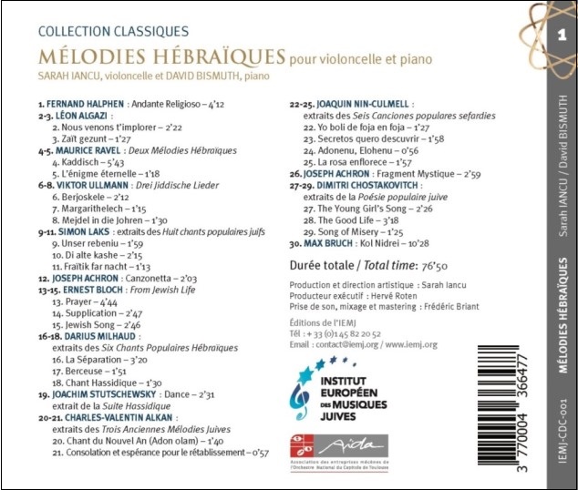 Sarah Iancu (Cello) und David Bismuth (Klavier) interpretieren auf dieser CD 30 Melodien inspiriert von Themen aus der chassidischen, jiddischen und jüdisch’spanischen Liturgie : vom berühmten Kaddish von Ravel bis zum Kol Nidrei von Max Bruch, vom Zyklus De la vie juive von Ernest Bloch bis zu den Chants populaires hébraïques von Darius Milhaud, sowie andere weniger bekannte jedoch nicht weniger schöne Werke von Joseph Achron, Léon Algazi, Charles-Valentin Alkan, Fernand Halphen, Simon Laks, Joaquin Nin-Culmell, Dimitri Chostakovitch, Joachim Stutschewsky und nicht zuletzt Viktor Ullmann.