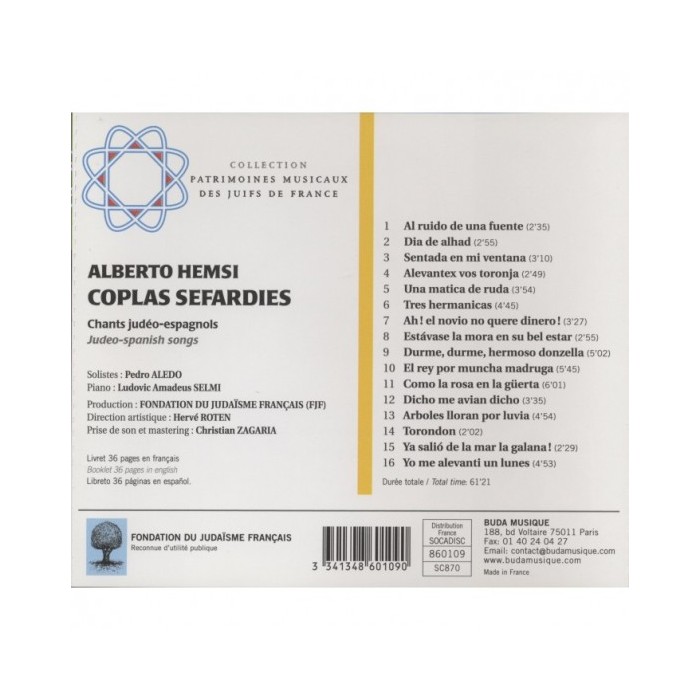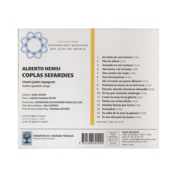 Published in Egypt (1932-1938) and France (1969-1973), the Coplas Sefardies are a collection of Judeo-Spanish songs for voice and piano composed by Alberto Hemsi from tunes and pieces of Spanish poetry.