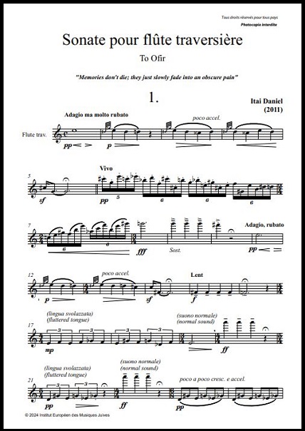 In 2004, Itai Daniel moves to Paris and decides to devote himself to composition. Among his major works in the Jewish tradition are three large cantatas (Mahzor Hayim, Shma Koleinu and B’reshït) and many compositions, large and small, based on major Jewish prayers and texts (Kaddish, Oseh Shalom, Adon Olam, Kol Nidrei, Yotzer, Haskivenu, Shalom Rav and many others). Among his non-Jewish compositions are a piano sonata, a flute sonata, an Elégie for cello and piano and Shlosha Yeladim for soprano and piano (dedicated to the children perished during the Holocaust). His works have been performed in England, the United States, Germany, Italy, South Africa, and France.