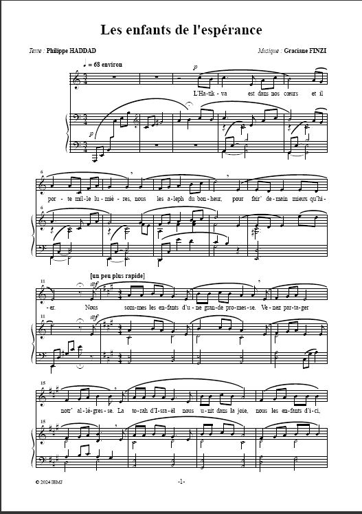 Les enfants de l’espérance is a vocal work in French and Hebrew for children’s choir and piano, by Graciane Finzi, based on a text by Rabbi Philippe Haddad. It was premiered in 2024 by the children of YWAM-Copernic’s Talmud Torah, directed by conductor Mélanie Levy-Thiébaut.