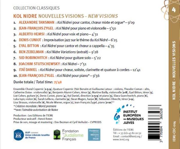 You can also hear the kol nidre of Alberto Hemsi (voice and piano), Denis Cuniot (improvisation Jazz), Eyal Bitton (cantor and choir a cappella), Ben Zebelman (piano, violin and cello), Sid Robinovitch (solo guitar) Joachim Stutschewsky (harp and cello), Jean-François Zygel (piano and cello) and Itaï Daniel (choir, tenor, clarinet and string quartet).