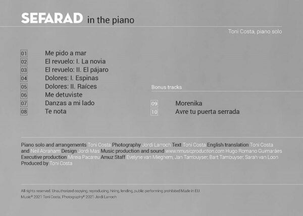 The music on this album is based on Sephardic folk songs revisited in the light of music from the 15th century to the present day, including baroque polyphony, flamenco and jazz. This original blend is brilliantly realized by pianist Toni Costa, who manages to transfer Spanish guitar techniques to his piano.