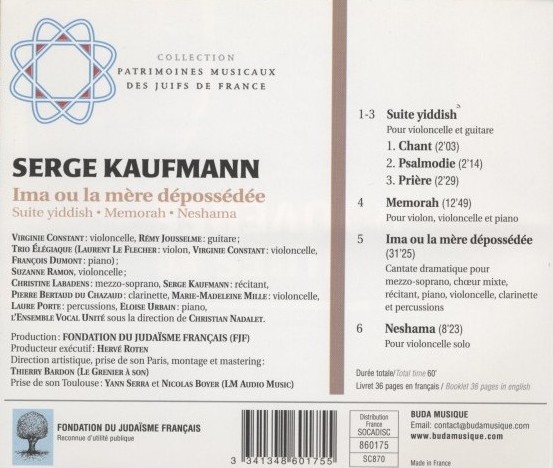 Diese achte CD der Sammlung des Musikerbes französischer Juden wurde von der Fondation du Judaïsme Français produziert und stellt die vier wichtigsten Werke von Serge Kaufmann vor. Da wäre zunächst einmal die Suite Yiddish, in einer intimen Fassung für Cello und Gitarre. Dann, das Streichtrio Memorah, welches zum allerersten Mal auf CD aufgenommen wurde. Es folgt anschließend das erhabene Neshama für Cello solo und schließlich, die Kantate Ima ou la mère dépossédée, in der die beraubte Mutter einen Schmerzensschrei ausstößt und in welcher die Quintessenz seines musikalischen Könnens deutlich wird.