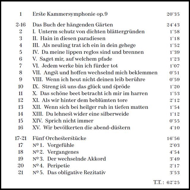 The last recording by Amaury du Closel (1956 – 2024), founder of the Forum Voix Etouffées in 2005, this recording presents three major works by Arnold Schönberg: First Chamber Symphony, Erste Kammersymphonie op. 9; The Book of Hanging Gardens, Das Buch der hängenden Gärten op. 15; Five Pieces for Orchestra, Fünf Orchesterstücke op. 16.