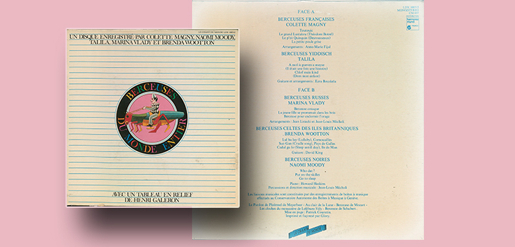 This disc, edited by the music label Le Chant du Monde in 1995, gathers 15 classicla lullabies from French, Yiddish, Russian, English and African folklore. It is the result of a collaboration of prestigious artists : Colette Magny, Naomi Moody, Talila, Marina Vlady and Brenda Wootton.