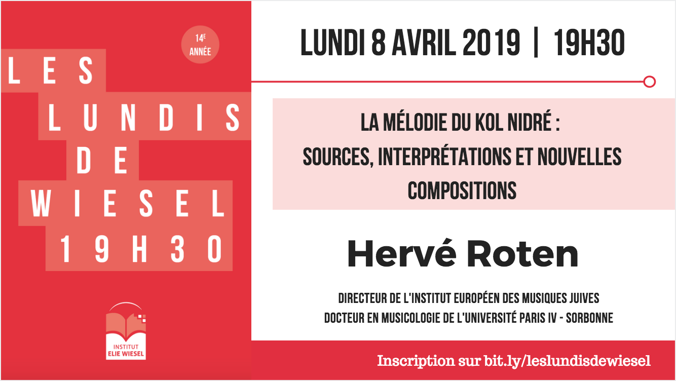 On the 8th April 2019 at 7h30 PM at the Institut Elie Wiesel in Paris (75010) audiovisual conference by Hervé Roten about the melody of the Kol Nidre, as part of the Lundis de Wiesel. REGISTRATION RECOMMENDED …