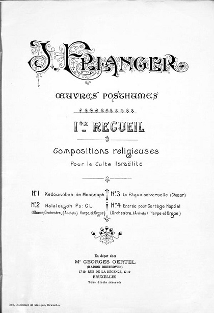 Jules Erlanger abandoned his musical career to eventually enter the world of business, and only composed sacred music. In 1891, the publishing house Durlacher in Paris published Erlanger’s Recueil de dix morceaux exécutés dans les synagogues de France et de Belgique (10 musical pieces played in French and Belgian synagogues). In 1903, eight years after his death, another four collections were published in Brussels: three collections of secular music and one collection of sacred music.