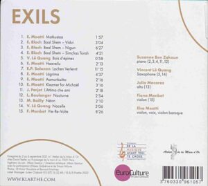 On the Seine, we embark with Elsa for a musical iourney in the company of some faithful friends. The waves carry us from one bank to another, from one exile to another. Elsa Moatti’s voice joins her violin at times, as if to give life to some voices buried in her memory, because those who are absent accompany us. Melancholy emerges. She dances with joy, the joy of being alive. There is no doubt that Elsa Moatti’s “Exiles” rhyme wilh memory. The memory of Michaël, on “exile” in his own way, a beloved brother whose life was cut short too soon. The memory of a corner of Finland, between sea and forest, and of moments shared with klezmer musicians. Strong and precious moments, in which Elsa drew the light and the energy essential to her rebirth, alter the cataclysm. Time passes, and transports us from one imaginary country to the next imaginary country.[1]Text by Elsa Moatti, from CD booklet