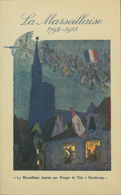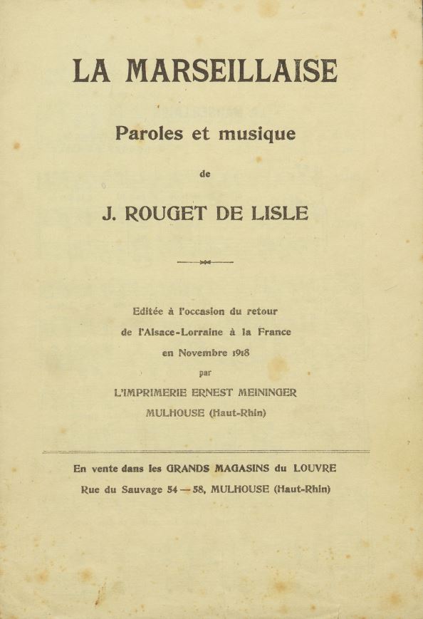 Notable documents include a score of La Marseillaise (the French national anthem), published in Alsace-Lorraine in 1918, and the program for a synagogal ceremony celebrating the return of Alsace to France. It also includes a rare photograph of Rabbi Isaïe Schwartz, Chief Rabbi of France, taken in 1942.