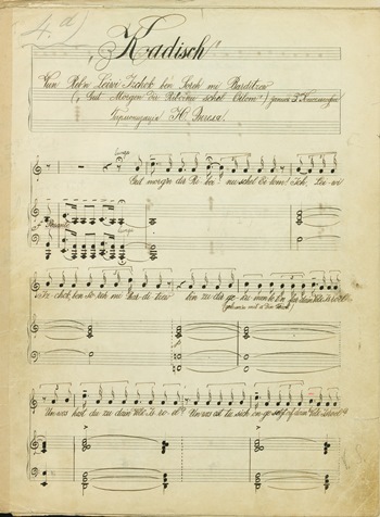 These scores, written by the hand of a Russian copyist (as evidenced by the use of Cyrillic in several song titles), contain mainly Yiddish folk songs, composed among others by Joel Engel or Moshe Milner (Main harz tsugeiht in mir, A dudke…) and Hebrew songs (Ani hadal, Modeh ani…). There is also an original arrangement of the Zionist hymn Hatikva, signed by Alberto Hemsi with the place and date of composition: Smyrna, 1919.