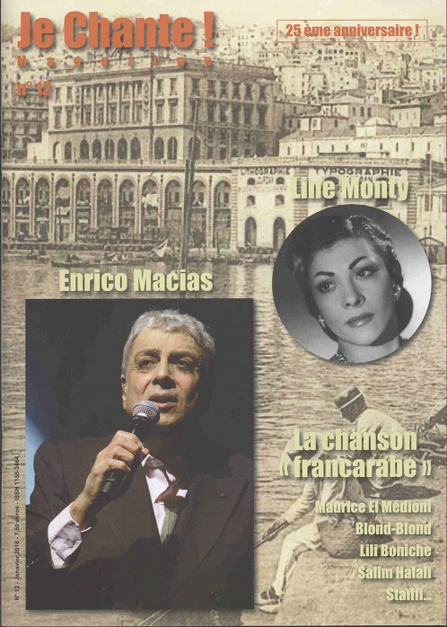 In the latest issue of Je chante ! Magazine, published in January 2016, the editing commitee, led by Raoul Bellaïche, prepared two big and inseparable files. The 1st is dedicated to Enrico Macias, famous artist of Northern African origins. 40 pages including his biography, a talk with the singer, and many other articles going back on his career, his life, and from where he got his inspiration. The 2nd file is dedicated more generally to the French-Arab song repertoire, with biographies of some of the best artists of this music : Line Monty, Blond-Blond, Maurice El Médioni, Salim Halali, José de Suza, Lili Boniche…
