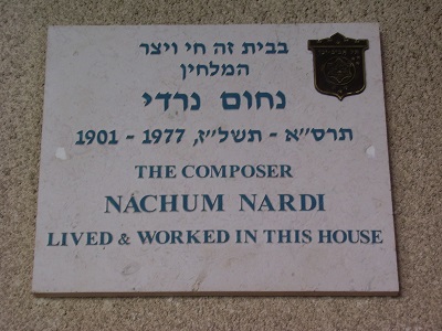 Nahum Nardi died in Tel Aviv in 1977 following several brain strokes. The Tel Aviv City Council, then headed by mayor Shlomo Lahat, conducted his funeral, and put the gravestone on his grave in Kiryat Sha’ul. After his death his family members, Rahel and Eran Nardi, collected his artistic legacy which included musical scores, recordings, and other documents, and handed it to the Archive of Israeli Music at Tel Aviv University. In September 2005, the Tel Aviv City Council erected a memorial board for Nardi on Kalonymus Street, where Nardi spent his last years. During Tel Aviv’s centennial year, the council decided to name a street after Nardi.