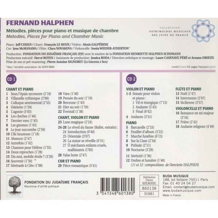 Pupil of Gabriel Fauré and Jules Massenet, Second winner of the Grand Prix de Rome in 1896, Fernand Halphen (1872-1917 ) is the author of numerous melodies, pieces for piano and chamber music. This album received the 2007 Orphée d’or for the best melody interpretation from the Académie du Disque Lyrique.