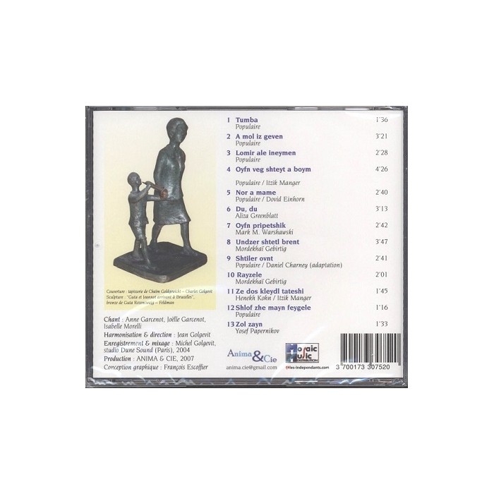 The texts of the songs of this CD - which were translated by Batia Baum - can be found entirely in the eponymous collection of scores including 38 Yiddish songs, Oyfn Veg, harmonized for choirs of 2 to 6 equal or mixed voices by Jean Golgevit and published by the House of Yiddish Culture in Paris. Thanks to this CD, one can without speaking Yiddish, understand the song and sing it in its original language. This sound medium, by offering an interpretation of melodies and choral singing, makes it possible to appropriate this repertoire, this type of music, the interest of which now largely exceeds the sole Jewish audience.