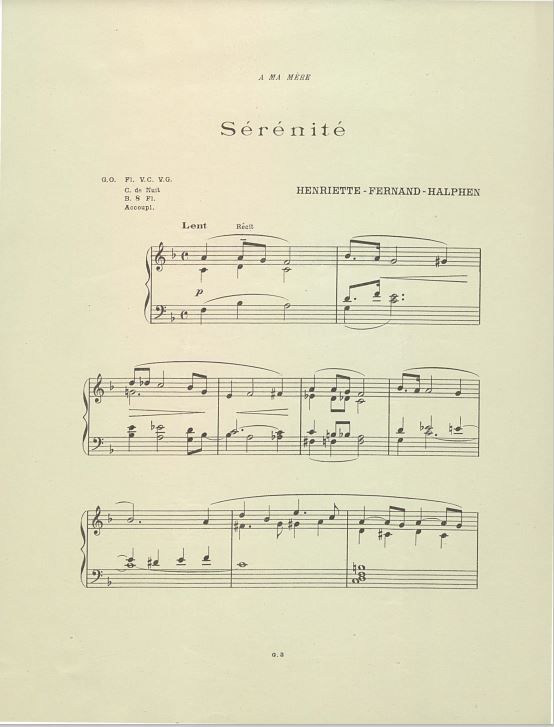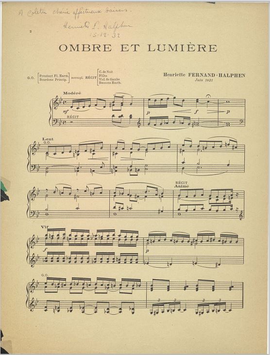 Daughter of Fernand Halphen and Alice de Koenigswarter, Henriette Halphen inherited a taste for music and art from her parents. In 1931, she composed two charming melodies for the organ, Ombre et Lumière and Sérénité (see below, in the IEMJ’s Halphen collection). It was only after her death that her precocious musical talents were discovered: Henriette remained discreet about her past, preferring always to speak of the present and the future.