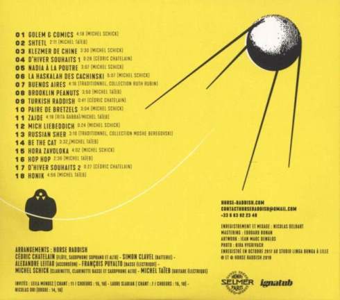 En estos tiempos en que lo distinto asusta, en que lo lejano no provoca más deseos, nosotros, Horse Raddish, nos alimentamos – SI – tomamos un bocado de la música nómada de estos pueblos parias. A veces melancólica, a veces endiablada, rica en su diversidad de historias, de amor y de tradiciones mezcladas. Ven a viajar… « No pidas indicaciones a alguien que conozca el camino, corres el riesgo de no extraviarte »… Erigiendo esa manera de pensar hebrea en manifiesto, Horse Raddish desplaza los raíces de la música Klezmer prestando atención extraviarse por atajos donde se cruzan un rock’n roll « crunchy » con un jazz vanguardista pero lúdico. Colectivo de improvisadores con la pasión de la interpretación como única ambición, Horse Raddish ha construido una sólida reputación en el escenario. Una música del corazón que contamina el cuerpo, que tiene que escuchar y bailar, sentado o de pie.