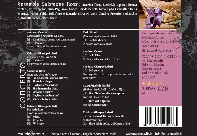 Este CD, grabado en 2008 por el Ensemble Salomone Rossi, ofrece una recopilación de obras emblemáticas de la música barroca judía que se desarrolló en Italia a partir del siglo XVII y continuó en Ámsterdam durante el siglo XVIII.