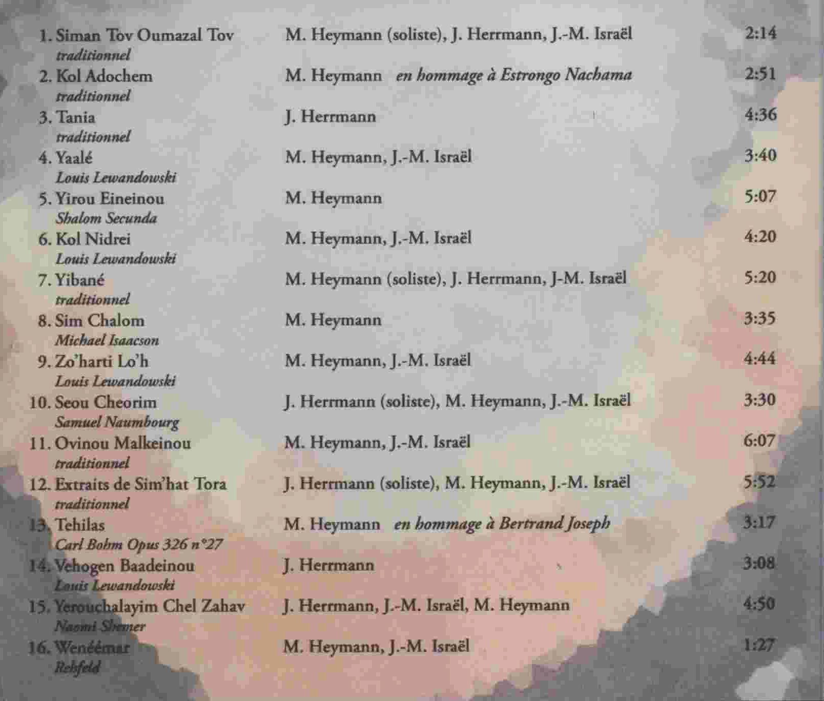 A principios de 2013, el cantor Michel Heymann donó todas sus grabaciones al Instituto Europeo de las Músicas Judías. El IEMJ le agradece calurosamente este regalo y se complace en presentar una de las siete grabaciones que componen la colección Michel Heymann, que ahora se conservará para las generaciones futuras en nuestras colecciones.