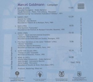 Marcel Goldmann, nacido en París en 1934, vive en Jerusalén desde 1991. Formado en el CNSM y después con Max Deutsch (alumno de Schoenberg), al principio escribió música en un estricto lenguaje serial, luego ampliado gradualmente, sobre todo mediante el uso de microintervalos.