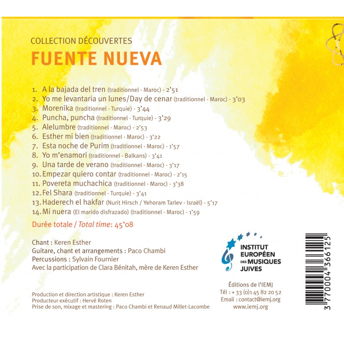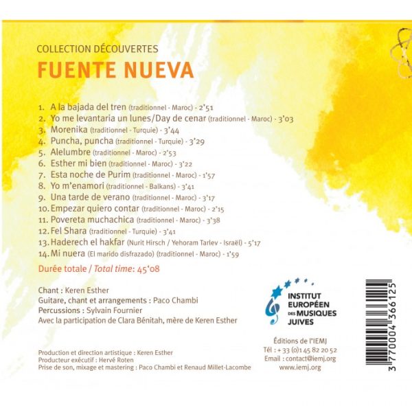 Accompanied in the guitar and in the percussions by Paco Chambi and Sylvain Fournier, this wonderful CD by Keren Esther exhales the sweet Mediterranean way of living, the smell of mint tea and the shade of the Moresque gardens.