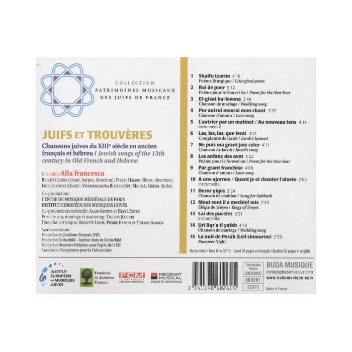 The songs from the Jewish communities of that time reflects the day to day life of the Jews, and the happy and sad events that created the rhythm of their lives. We hear the vocal expression of a population, the keeper of its rituals and traditions, that was nevertheless totally integrated with its environment. Speaking in the Oïl language, only the prayers, liturgical poems and studies remain in Hebrew.