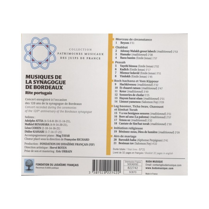 Recorded during a concert held on 14 October 2002 to commemorate the 120th anniversary of the Synagogue of Bordeaux
