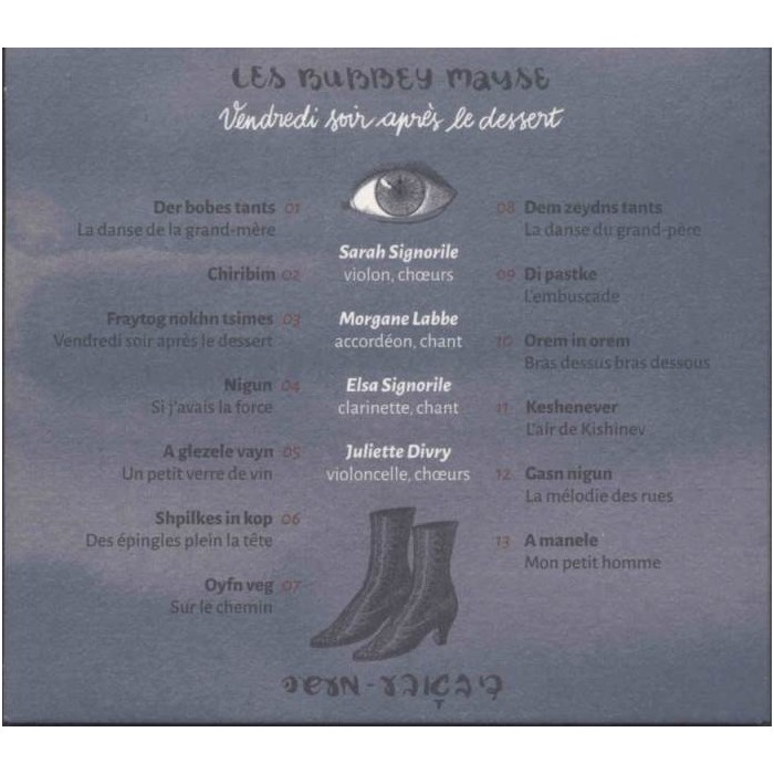 This 1st CD from the quartet of singers and musicians Bubbey Mayse revisits klezmer music and Yiddish song with delicacy and modernity.
