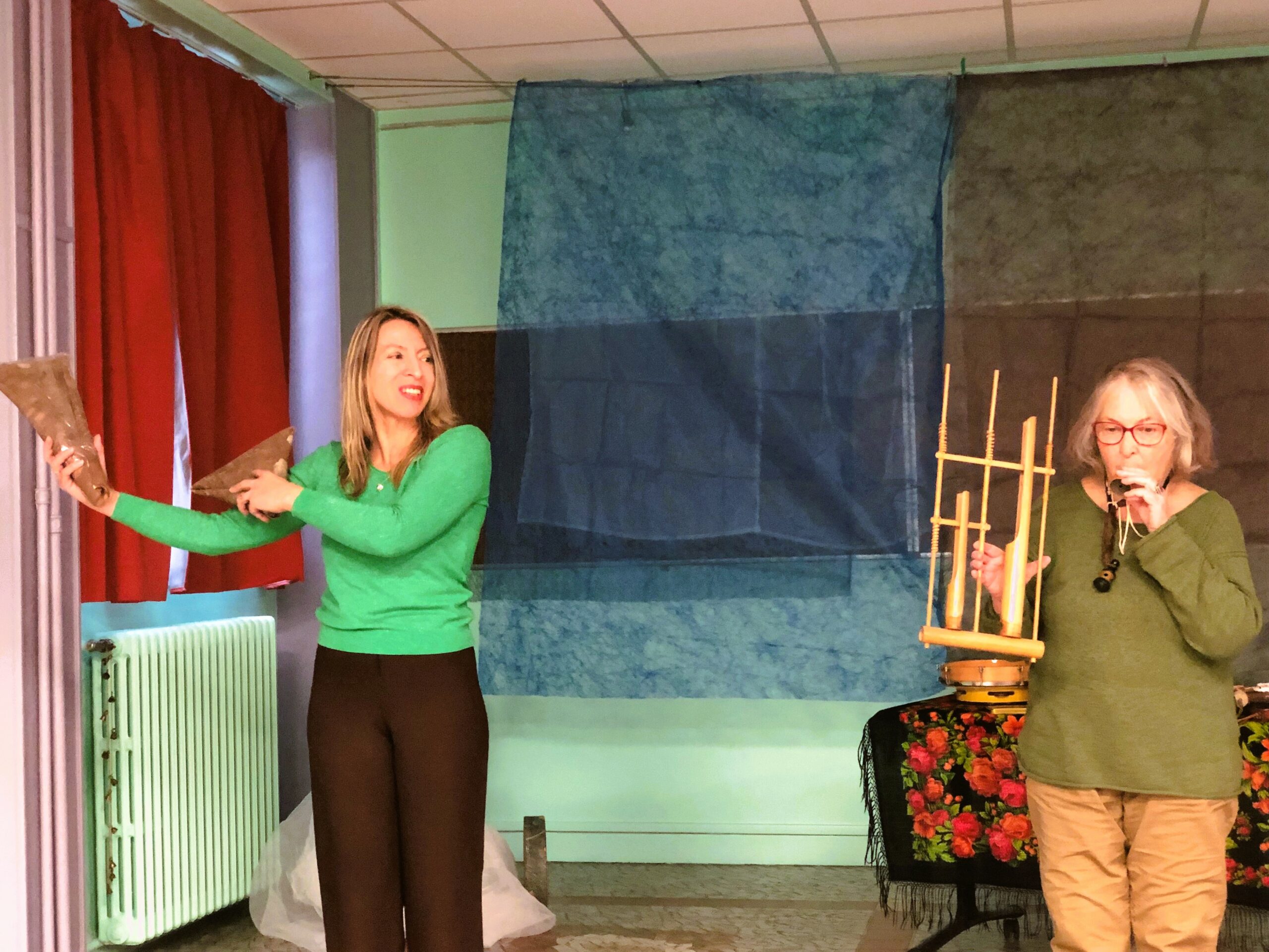 au chapeauDeux contes merveilleux, doux et poétiques qui parlent d’un monde où un oiseau vole à la recherche de couleurs qu’il offre à ses amis, où le vent console l’arbre en peine… où des amis se perdent et se retrouvent. Extraits du livre « Contes de Bobè » écrit par Edith Apelbaum et publié aux éditions Borealia, Imaginaires du Nord et d’ailleurs, le spectacle mêle subtilement des chants d’Europe de l’Est et du Nord (en yiddish, russe, finnois…) et la magie d’un accompagnement musical (d)étonnant à partir d’un « coquillophone », de papiers de soie, de coquilles d’escargot, et d’instruments venant de pays lointains, Grâce aux talents de Mirélè Rozen et Cristina Agosti-Gherban, ces contes, tour à tour malicieux, tendres et poétiques transporteront le jeune public dans un univers de rêve et de fantaisie où les enfants deviendront oiseaux ou nuages.