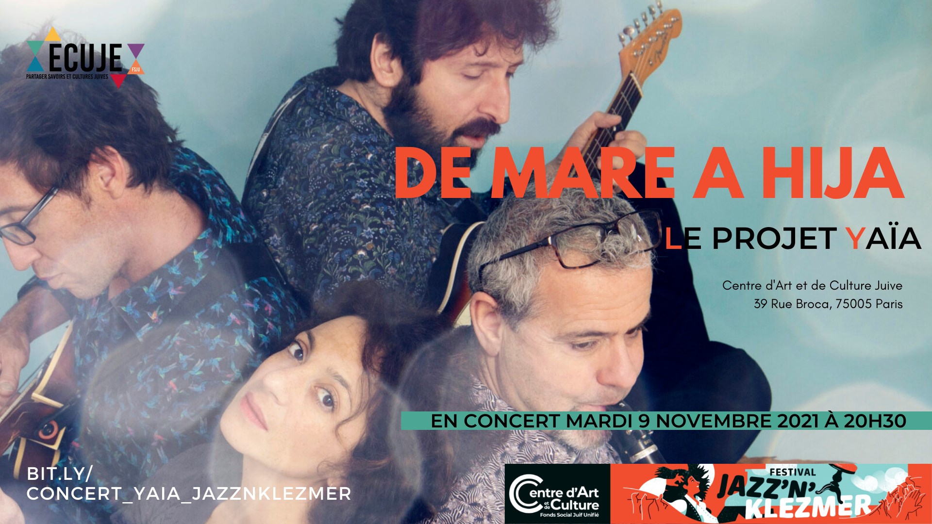 8€ à 50€De mare a hija avec Yaïa, un concert en co-production avec le Centre d’Art et de Culture Juive (FSJU) et l’ECUJE dans le cadre du Festival Jazz’N’Klezmer 2021 (https://jazznklezmer.fr/).