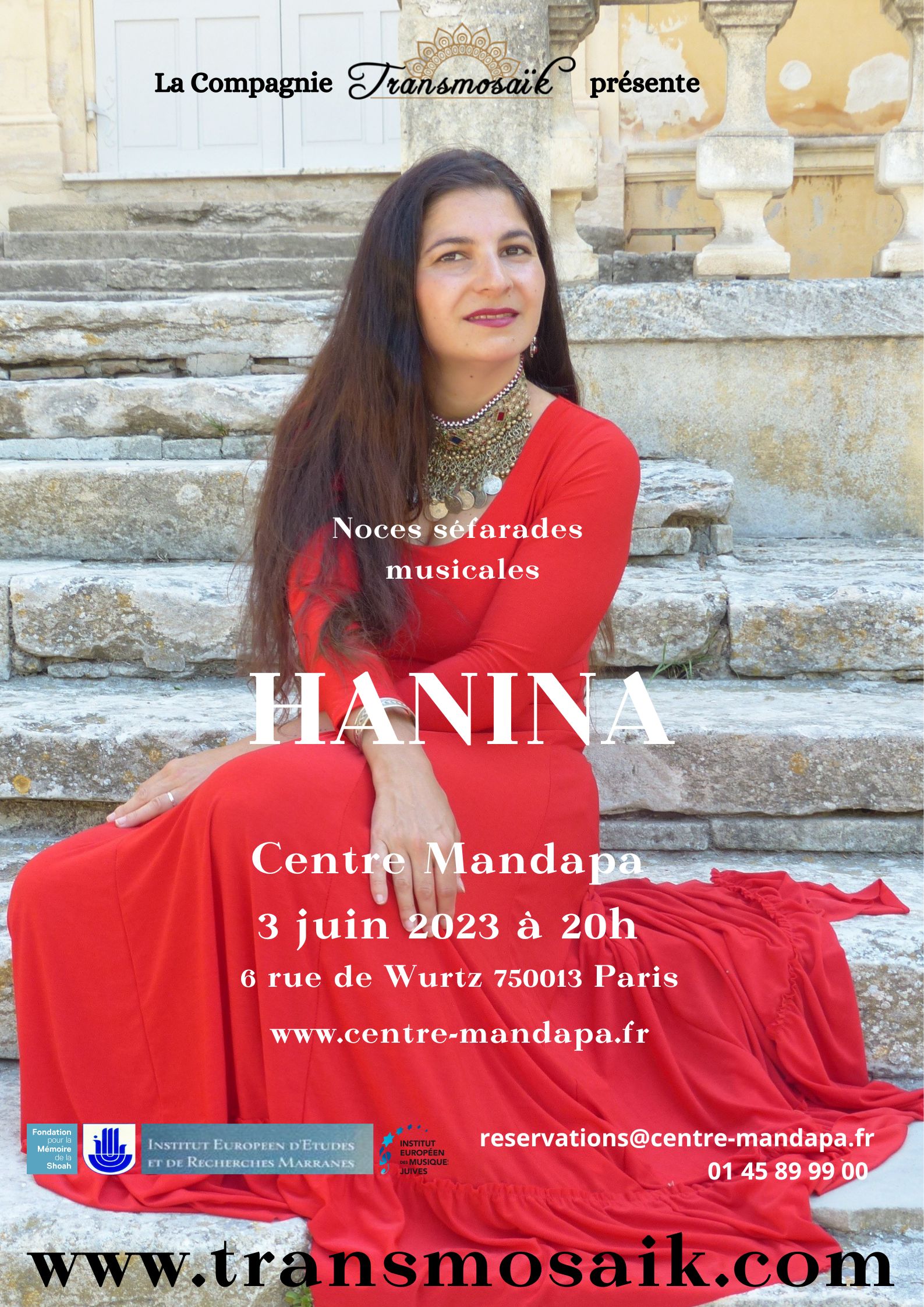 8€ à 16€Le spectacle musical Hanina, proposé par la Compagnie Transmosaïk, revisite les chants de noces séfarades de l’Ex-Empire Ottoman. 4 artistes sur scène (Y. Morciano: Chant ; G. Juignier : Ney, Clarinette, Kaval; E. Vettas : Bouzouki; N. Derolin : Percussions) pour vous faire découvrir de nombreux rituels de mariage à travers des chansons judéo-espagnoles originaires de Turquie, Bulgarie, Yougoslavie et Grèce.