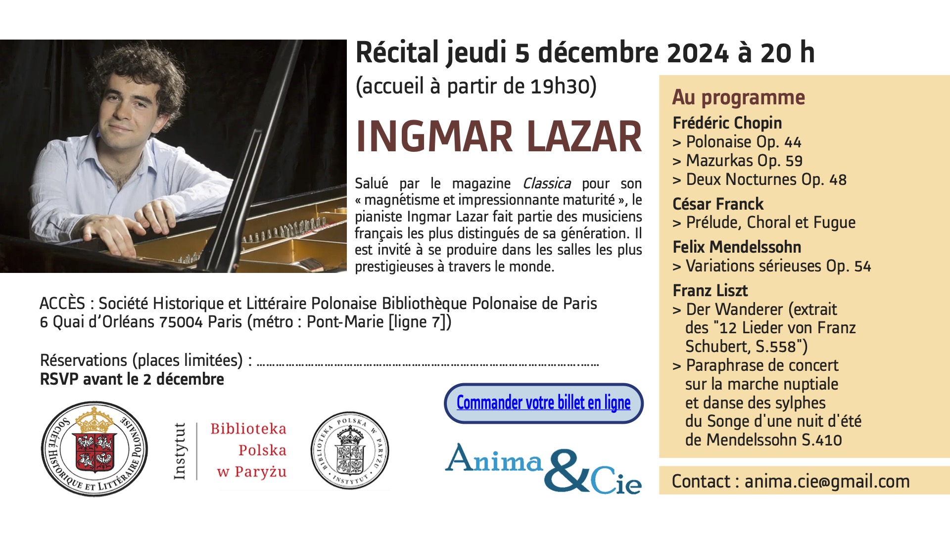 Salué par le magazine Classica pour son « magnétisme et impressionnante maturité », le pianiste Ingmar Lazar fait partie des musiciens français les plus distingués de sa génération. Il est invité à se produire dans les salles les plus prestigieuses à travers le monde.