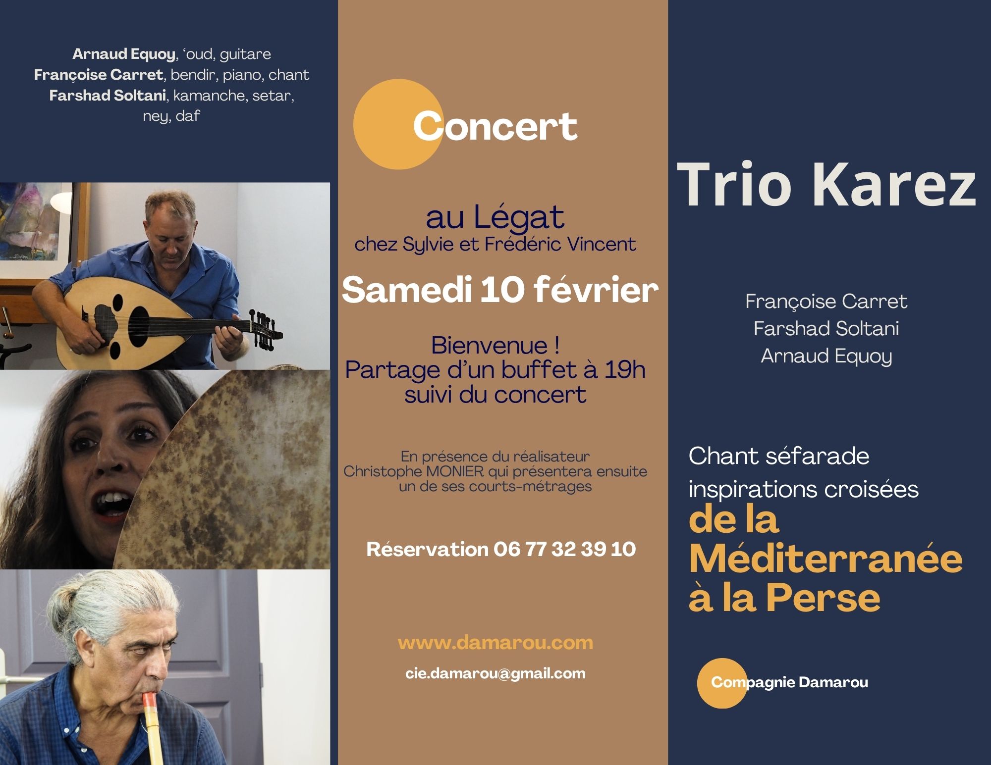 Le trio Karez est né d’un désir de partage entre Orient et Occident. Mêlant au chant séfarade des mélodies improvisées ou rapportées de différents pays, le répertoire du trio traverse la Méditerranée d’Al Andalus jusqu’à la Perse, dans une complicité entre musique modale et musique tonale. Fruit de la transmission orale et des collectages, le répertoire chanté en judéo-espagnol est ici mâtiné d’influences multiples, dans un esprit de lien et de paix entre les cultures. Françoise Poongodi au chant, à la percussion et parfois au piano, est accompagnée par Farshad Soltani, musicien iranien multi instrumentiste (setar, kamanche, ney, daf), et Arnaud Equoy aux ‘oud et guitare.