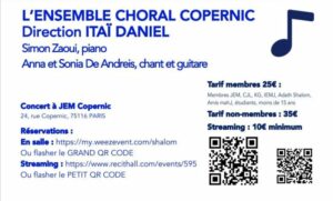 10€ à 35€L’Ensemble Choral Copernic, sous la direction d’Itaï Daniel, vous invite à un moment musical exceptionnel dédié à la paix.