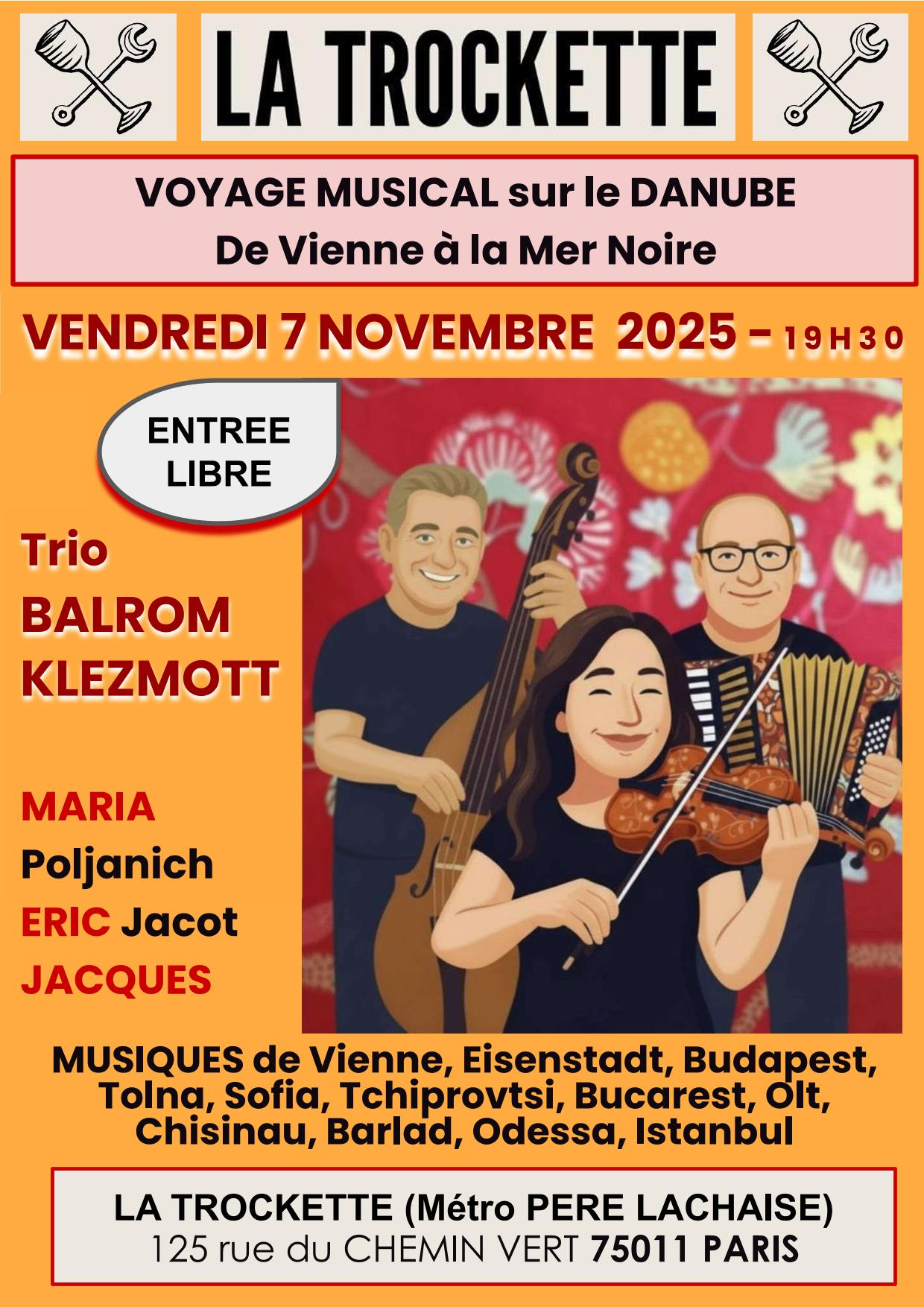 GratuitLe trio – Violon Contrebasse Accordéon – BALROM KLEZMOTT donne un concert le Vendredi 7 novembre 2025 à Paris 11