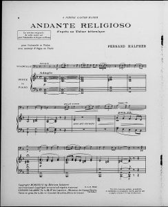 Dédiée à l’avocat Pierre Gaston-Mayer (1884-1914), cette œuvre pour violon ou violoncelle et clavier (orgue ou piano) de Fernand Halphen a été composé à Deauville le 31 août 1913. Sa particularité ? L’air principale de la mélodie est calquée sur celui de la prière du vendredi soir Veshomerou chantée dans les synagogues consistoriales de rite ashkénaze.